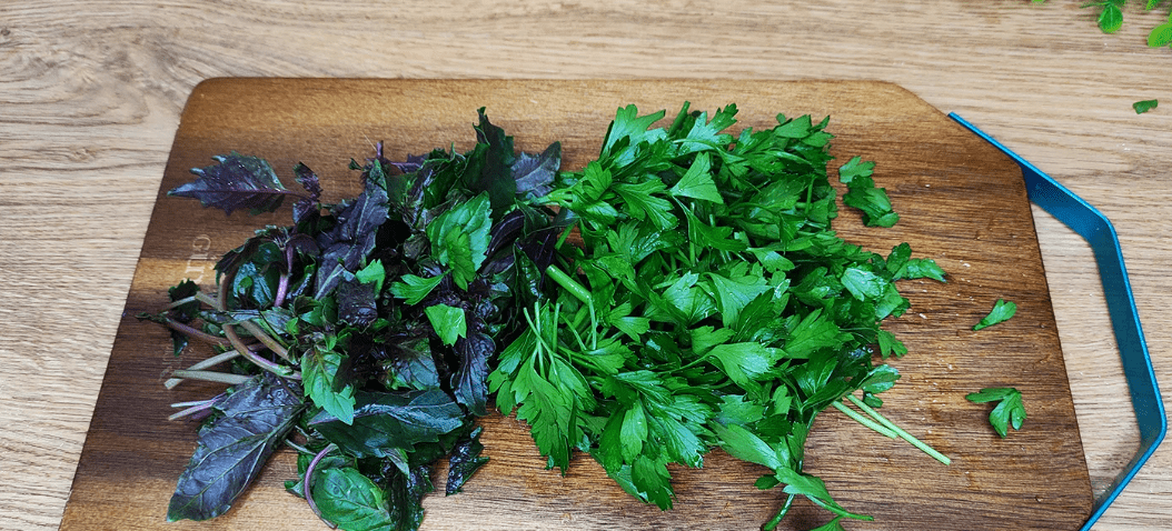 Дрібно нарізаємо петрушку, базилік або перекручуємо на м’ясорубці та відправляємо чашу до перцю.