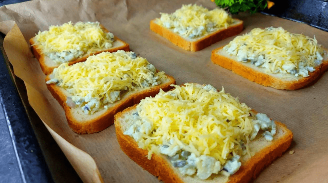 Викладаємо на деко пергаментний папір. Потім тостерний хліб. Розподіляємо яйця з цибулею та посипаємо сиром (сир натираємо на дрібній тертці).
