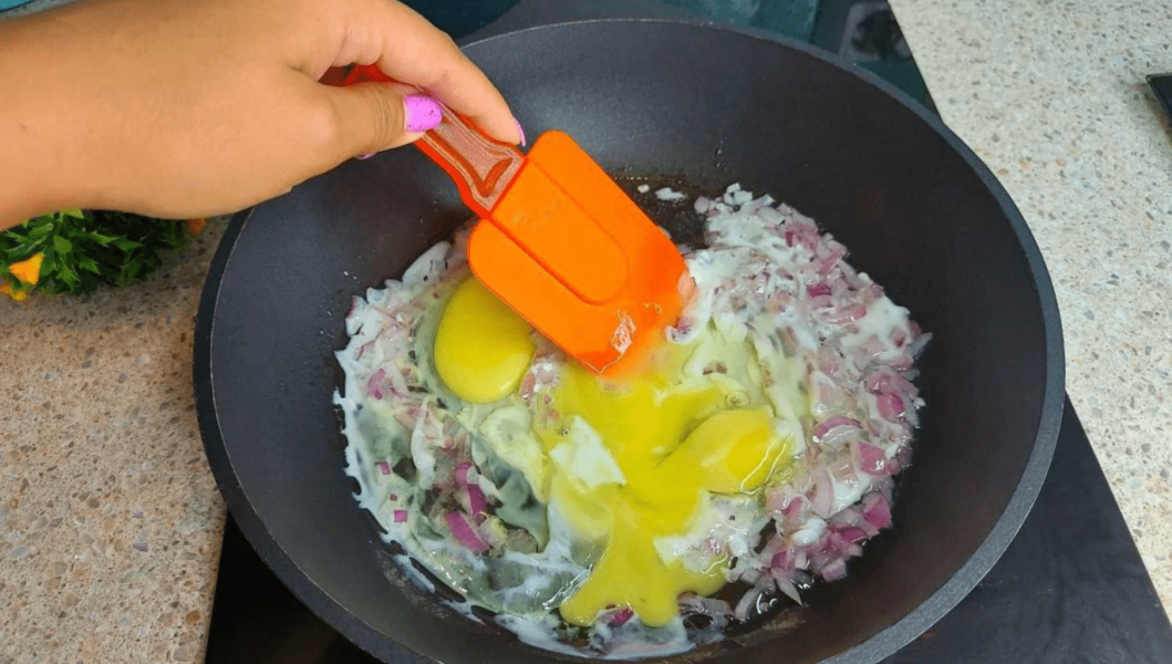 Отже, на сковороді обсмажуємо нарізану цибулю, до неї додаємо два яйця, щіпку солі перемішуємо. Готово.