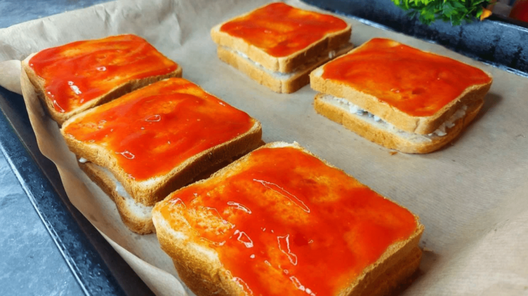Накриваємо другим шматочком хліба, змащуємо кетчупом, в мене це домашній кетчуп.