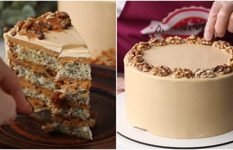 Торти0Рецепт ніжного торта “Смаківниця”: макові коржі та крем з вареним згущеним молоком, горішками та родзинками – це неймовірна смакота
