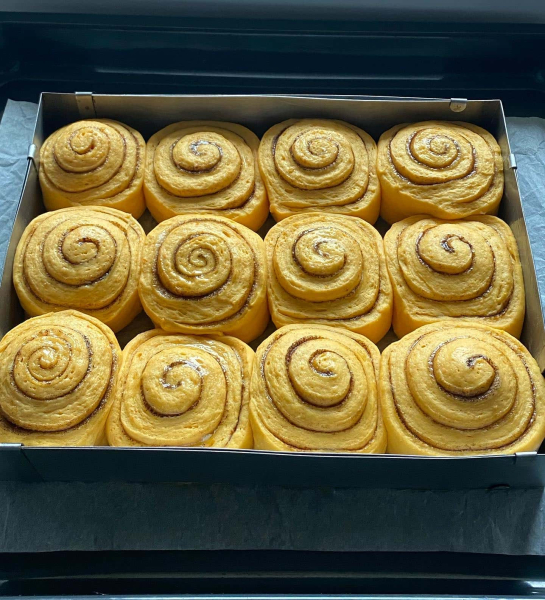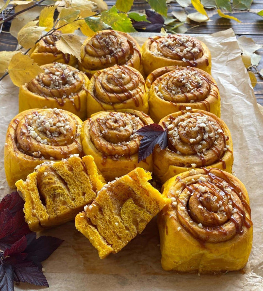 Щороку в сезон гарбуза я печу ці чудові сонячні булочки гарбузові Сіннабон. Булочки неймовірно смачні, ніжні, пишні, повітряні, м’які, пряні, политі карамельним соусом і посипані горішками.