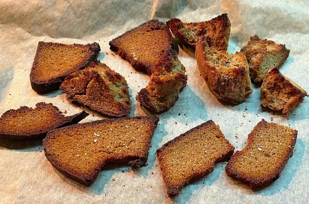 Отже, у мене був підсохлий житній хліб, приблизно 1/3 буханця. Я розклала скибочки на деко і запікала їх до рум’яного кольору, люблю навіть трохи перетримати, щоб шматочки злегка підгоріли.