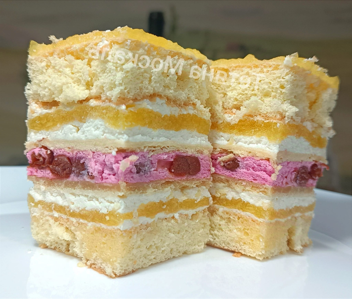 Зібрати торт у розсувному кільці з ацетатною стрічкою, чергуючи коржі та крем,