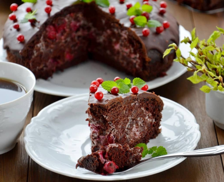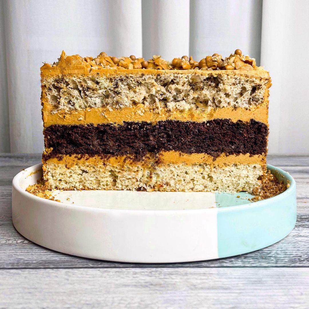 - Зібрати тортик, змастивши коржі, верх і боки кремом. Шоколадний корж покласти в середині, так розріз буде красивішим. Потім відправити торт в холодильник і почекати хоча б 3 години (або ніч).