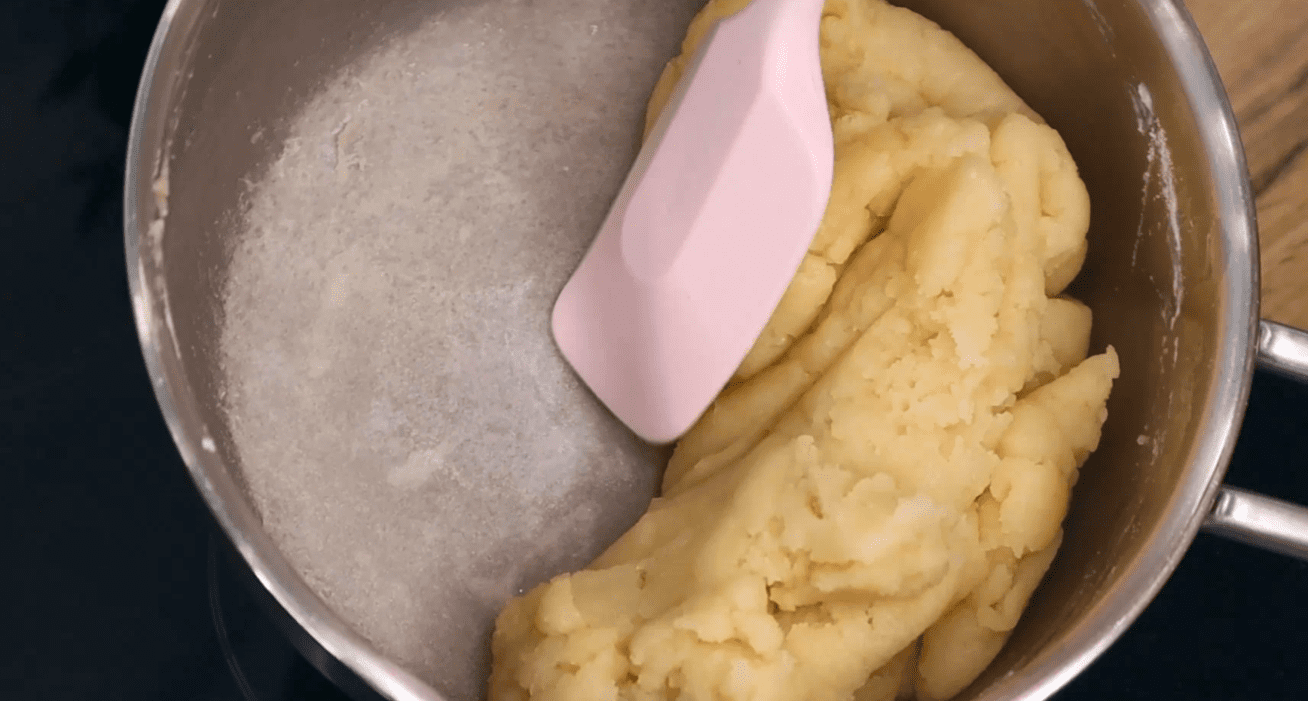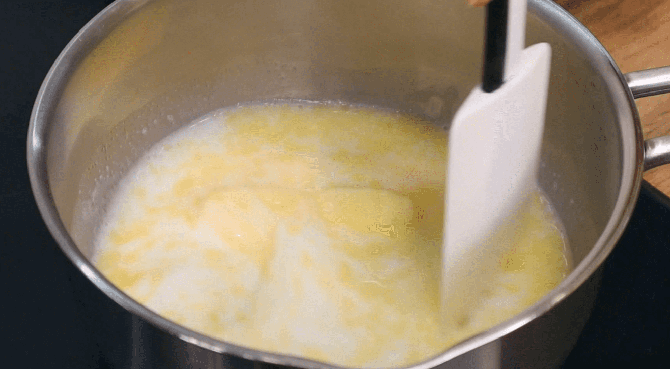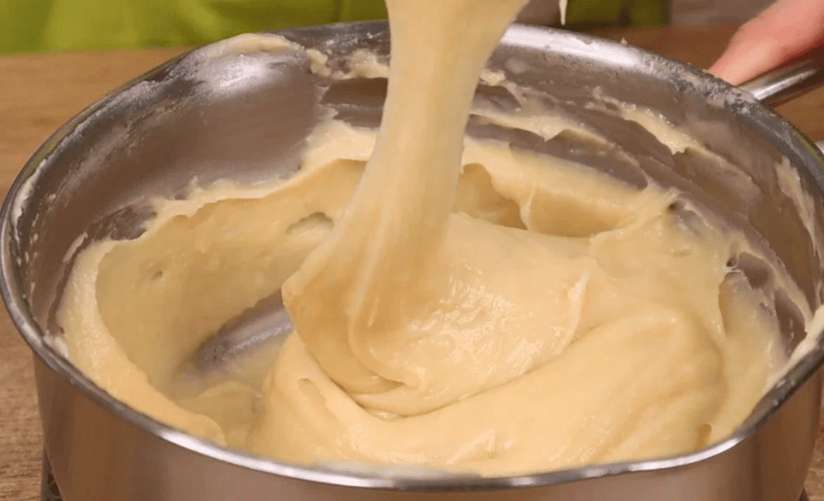 У гаряче молоко всипаю відразу все борошно і швидко перемішую заварюю тісто. Сотейник залишається на плиті та на середній температурі, постійно помішуючи випарюю рідину. Тісто збереться в єдину грудочку без вкраплень борошна. Коли на дні утворюється така борошняна кірка, можна знімати.