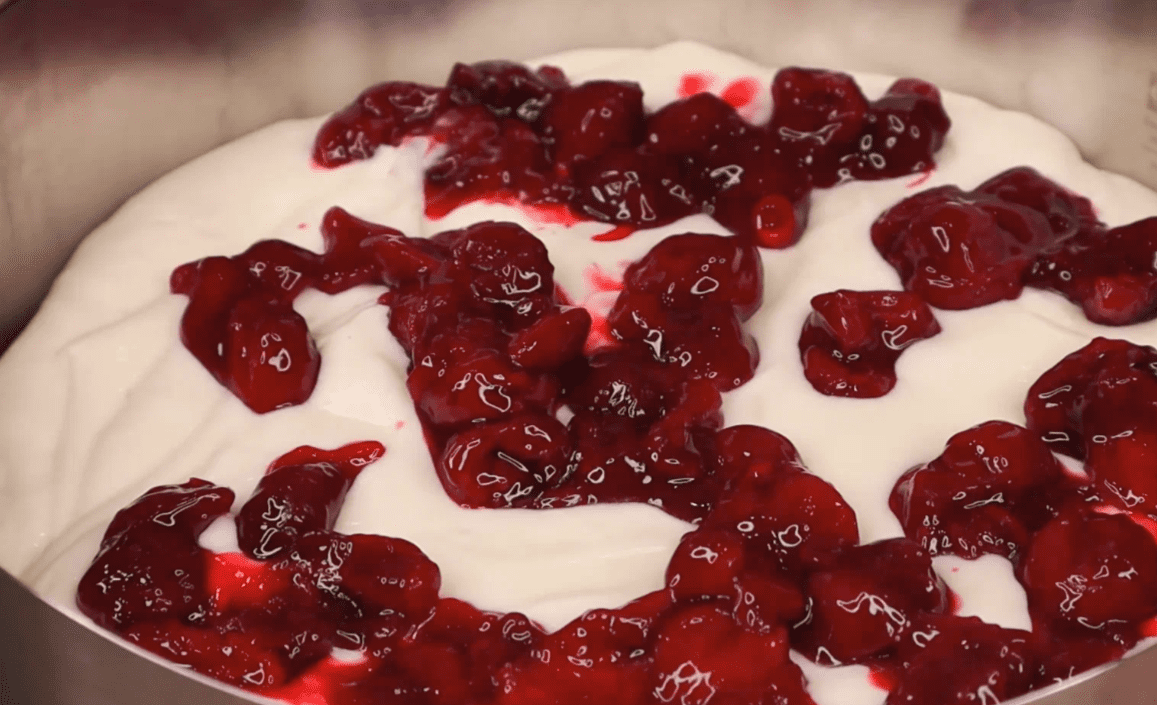 Заливаю кремом, вирівнюю шар. І викладаю другу частину вишневого конфітюру.