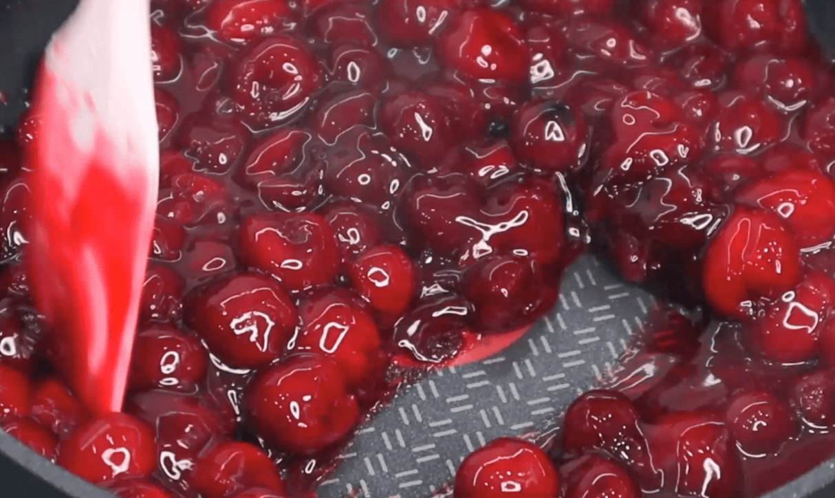 КОНФІТЮР. Вишню розморожую, викладаю на сковорідку разом із соком. Змішую з цукром і кукурудзяним крохмалем, в цей момент холодна вишня не нагріта, якщо буде вже гарячою, то крохмаль піде грудочками. Тепер вмикаю вогонь і постійно помішуючи доводжу вишню до загустіння, потім даю повністю охолонути.