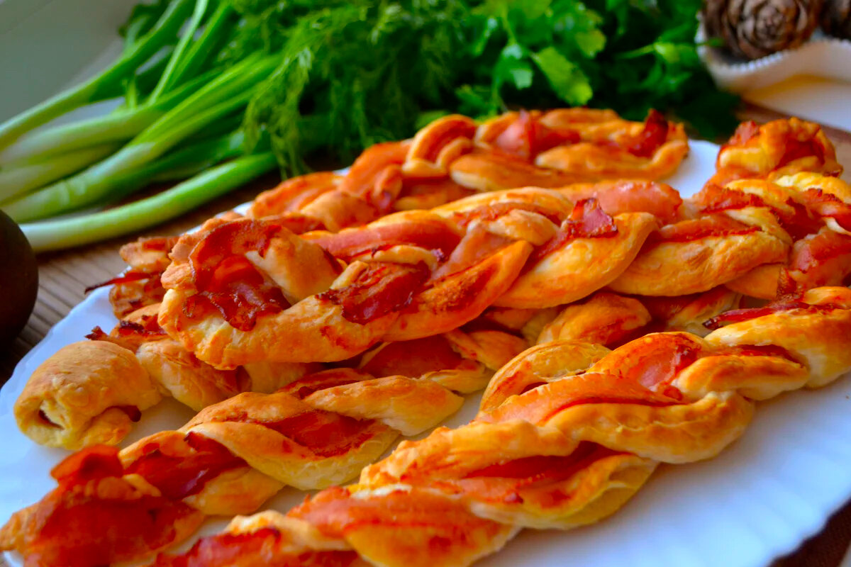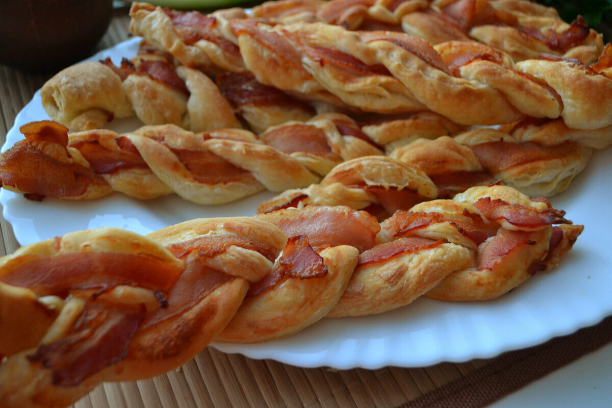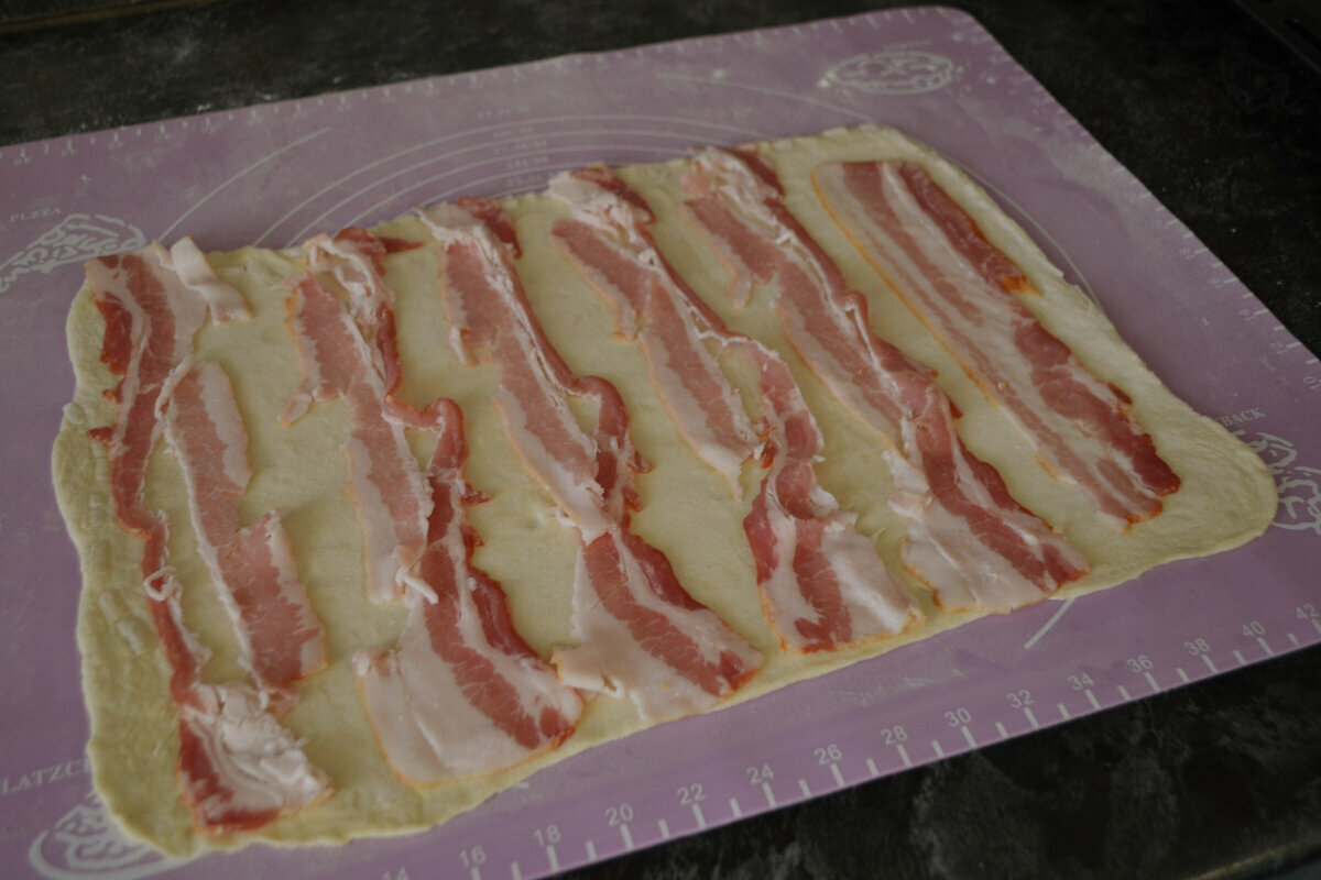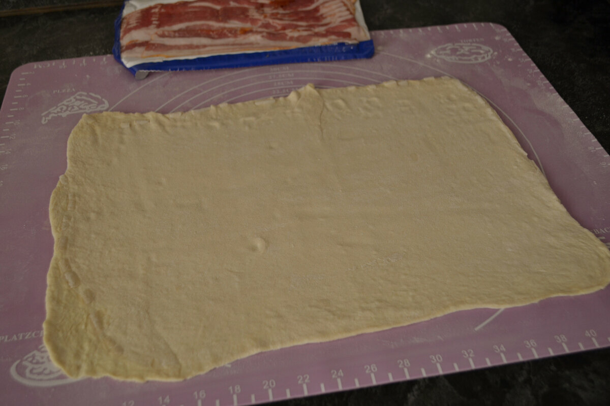 Пласт листкового дріжджового тіста розкачуємо розміром, а точніше довжиною за розміром довжини бекону.