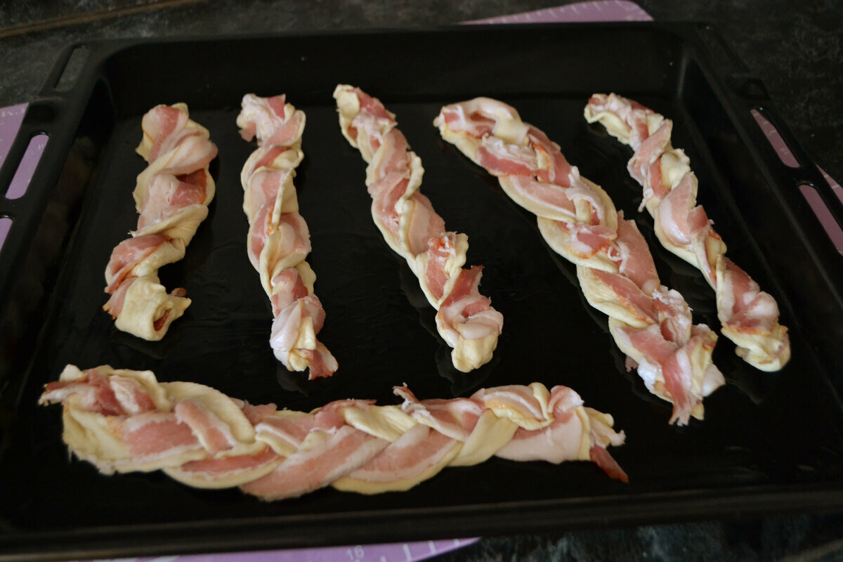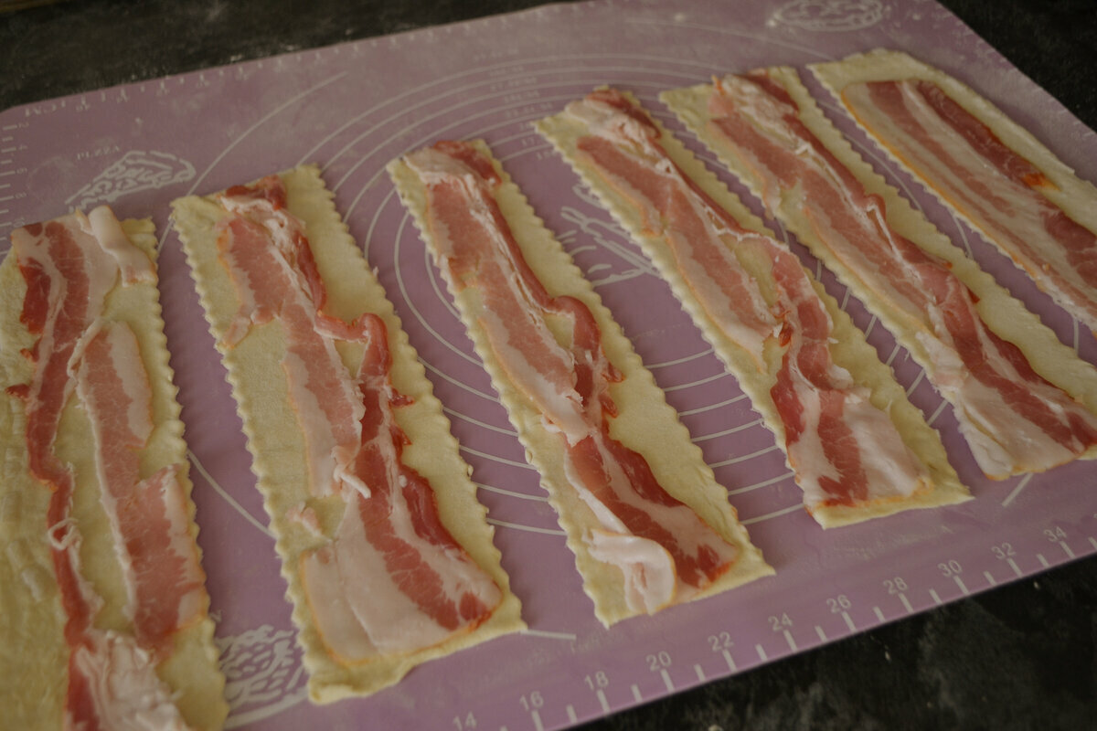 Після кожен шматочок тіста з беконом розрізаю навпіл,