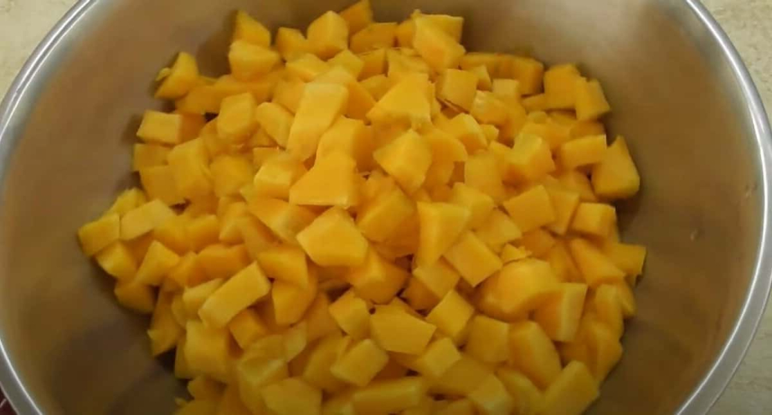 Гарбуз ( у мене сорт Хоккайдо ) очищаємо від шкірки і нарізаємо на невеликі кубики. Поміщаємо гарбуз в глибоку ємність, в якій в подальшому і будемо варити джем.