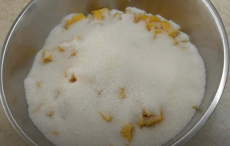 Засипаємо гарбуз цукром. Його кількість ви можете регулювати під себе. Ми залишаємо гарбуз на 30 хвилин, щоб виділився сік.