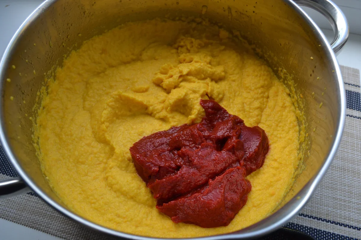 Ось так у результаті виходить. Тепер до готової маси додаю сіль, цукор, оцет, ставлю на дуже повільний вогонь, каструлю обов’язково накриваю кришкою, так як ікра при варінні почне “пихкати”, можна ошпаритися.