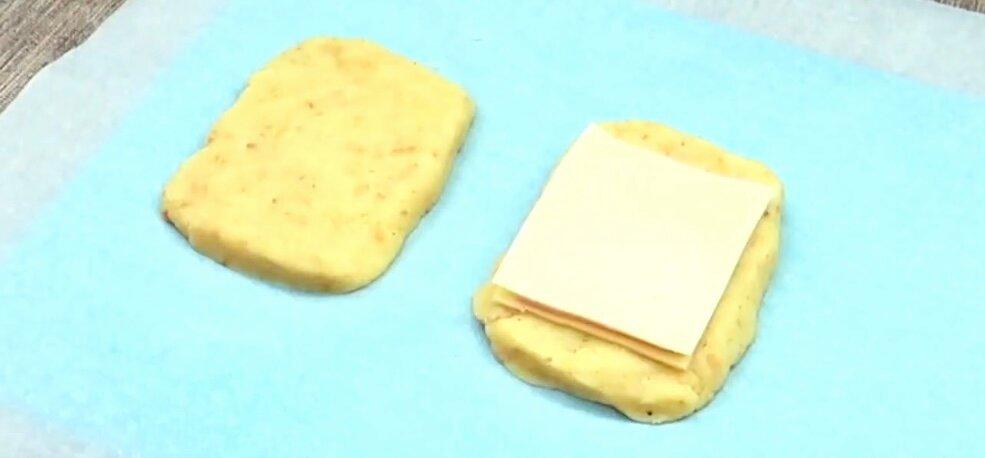 На одну викладаємо сир, шинку, знову сир. Потім зверху кладемо другий корж і закриваємо краї.