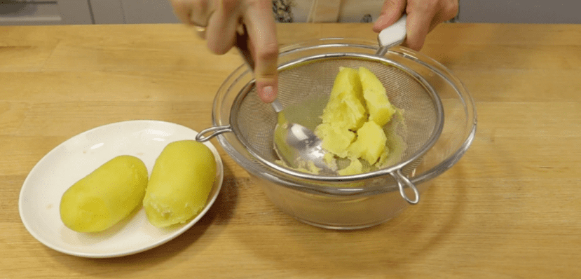 Тісто. Насамперед потрібно підготувати картопляне пюре. Готового пюре потрібно 250 г, сирої картоплі беру 350 г. Картоплю потрібно відварити, очистити та перетерти через сито. Остудити.