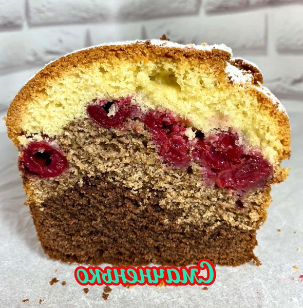 Спочатку коричневе з какао, потім горіхове, на нього щільно одна біля одної вишні🍒потім зверху світле тісто.