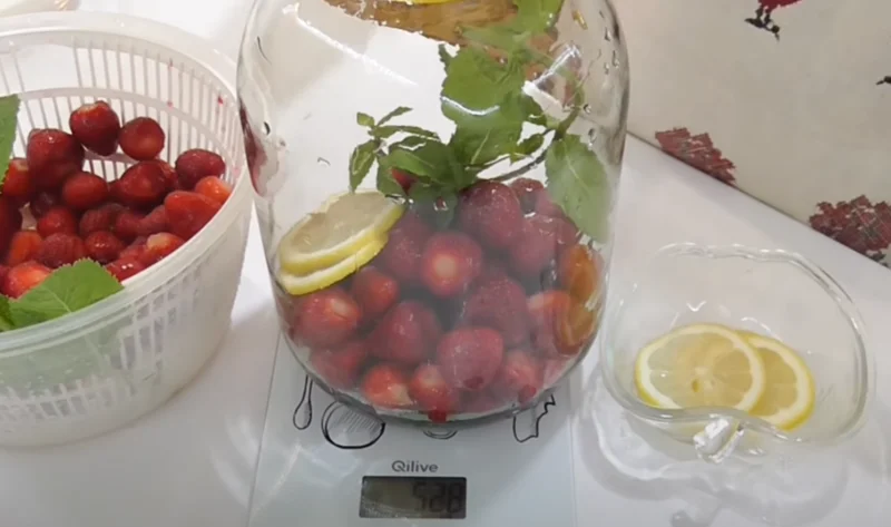 Підготуйте всі продукти: вимийте їх та очистіть. Лимон наріжте кружальцями. Наповніть банки, кількість усіх інгредієнтів вказана у списку. Самі банки заздалегідь вимийте з содою і просушіть, стерилізувати їх необов’язково, тому що в них закладаються сирі ягоди.