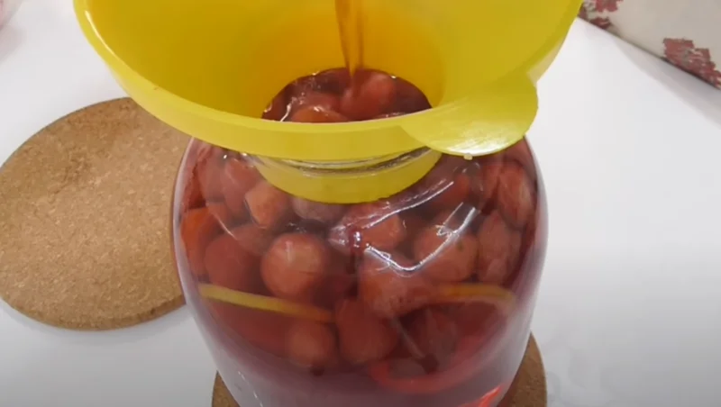 Залийте киплячим сиропом плоди, наповнюючи банку до країв.