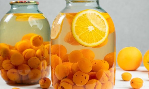 Налити холодну воду, замочити у ній м’яту; Використовуючи соду, помити апельсин, нарізати кружальцями, видалити всі кісточки; Плоди абрикосів поділити навпіл, вийняти кісточки; Усі складові помістити у ємність, додають цукор; Залишилося залити окріп, накрити кришкою та почекати 20 хвилин.