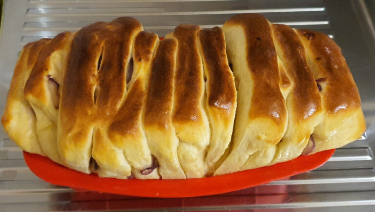 Потім кожну частину розкачую в пласт, край якого викладаю смужкою джем і згортаю в рулет до половини пласта. На частині, що залишилася, роблю по ходу скачування тіста розрізи товщиною в 1 см, але не до кінця, залишивши до краю теж 1 см.