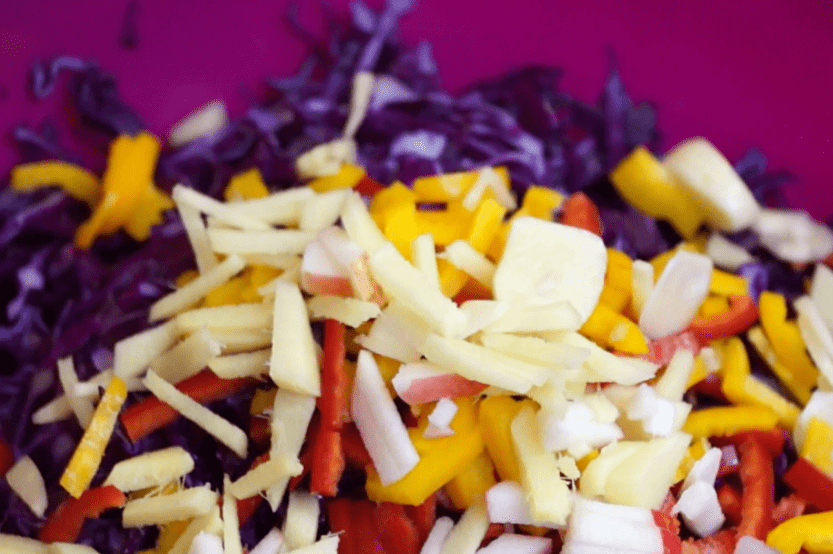 Дрібно нарізаємо 2 зубчики часнику, 30 г кореня імбиру, половину яблука, 70 г болгарського перцю.