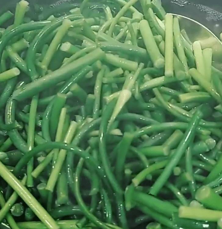 Молоді стрілки часнику вимийте, наріжте паличками приблизно по 3-4 см, бланшуйте в окропі протягом 2 хвилин.