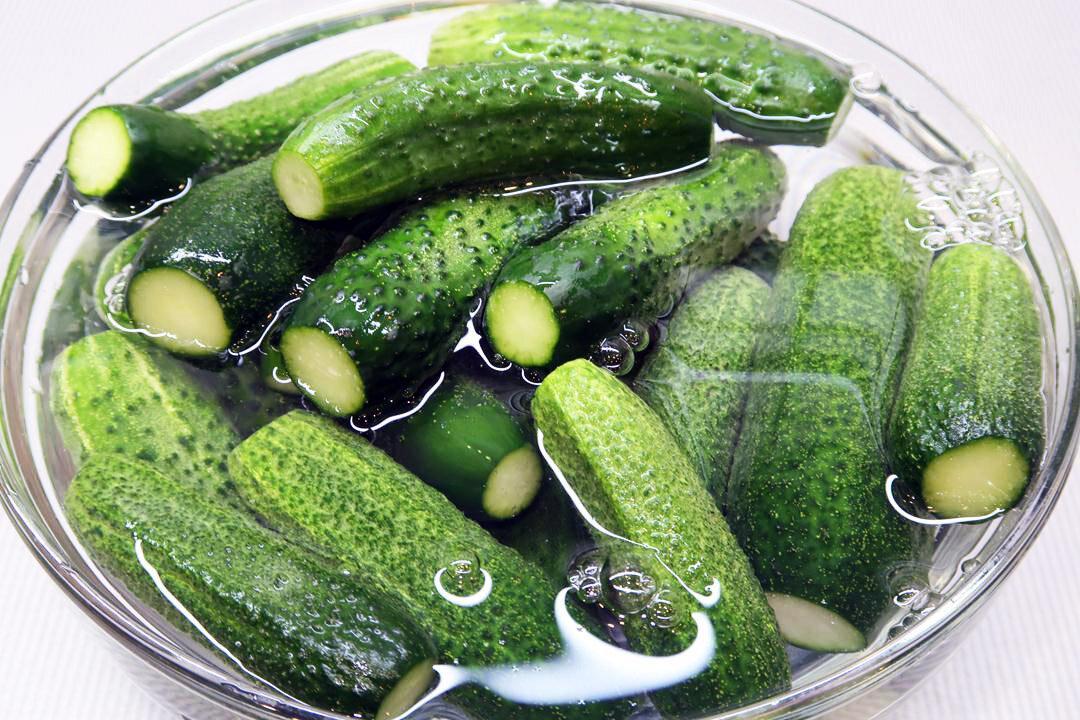 Огірки для консервації відбираємо невеликі, без пошкоджень. Огірки промиваємо в холодній воді. Потім у огірків відрізаємо обидва кінчика. Щоб огірки вийшли хрусткими, замочуємо їх в холодній воді на 2 – 3 години. Якщо ви використовуєте огірки тільки що зібрані з грядки, то їх можна не замочувати.
