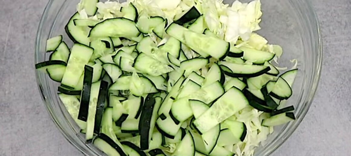 Свіжий огірок розрізаємо навпіл і нарізаємо соломкою ( або можна кубиками, кому як більше подобається ). Викладаємо в чашу до капусти.