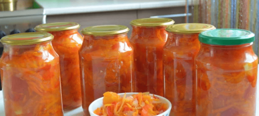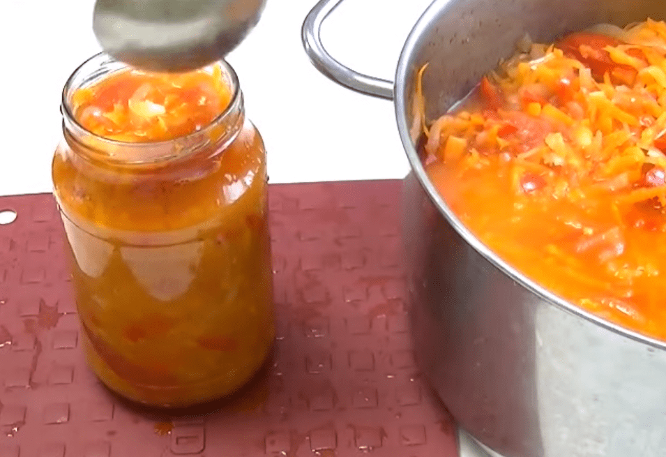 Перевертаємо баночки уверх дном, накриваємо ковдрою до повного остигання. Охолоджені баночки з салатом “Парамоніха” прибираємо в підвал на зберігання.