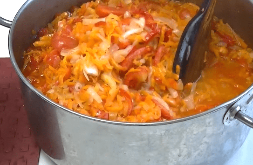 7. Пройшло 30 хвилин, перемішуємо всі інгредієнти і відправляємо салат на вогонь. Перемішуючи, доводимо до кипіння, як тільки закипів дивимось чи достатньо соку, в мене потрібно було добавити 500 мл. З моменту закипання тримаємо салат на середньому вогні 30 хвилин, варимо під кришкою.