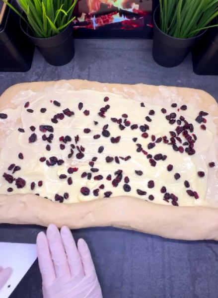 🔻Тісто розкачуємо в прямокутник, змащуємо начинкою і посипаємо родзинками.