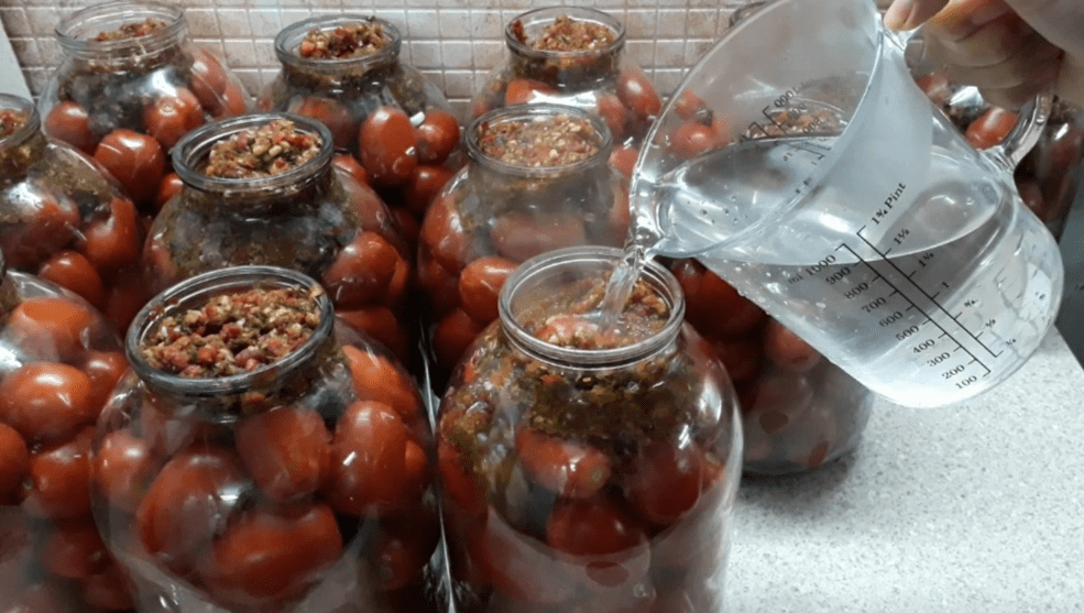 Заповнюємо всі баночки з помідорами овочевою заправкою.
