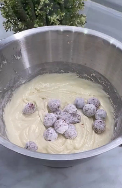 Вишні перемішуємо з крохмалем або борошном і додаємо в тісто, перемішуємо.