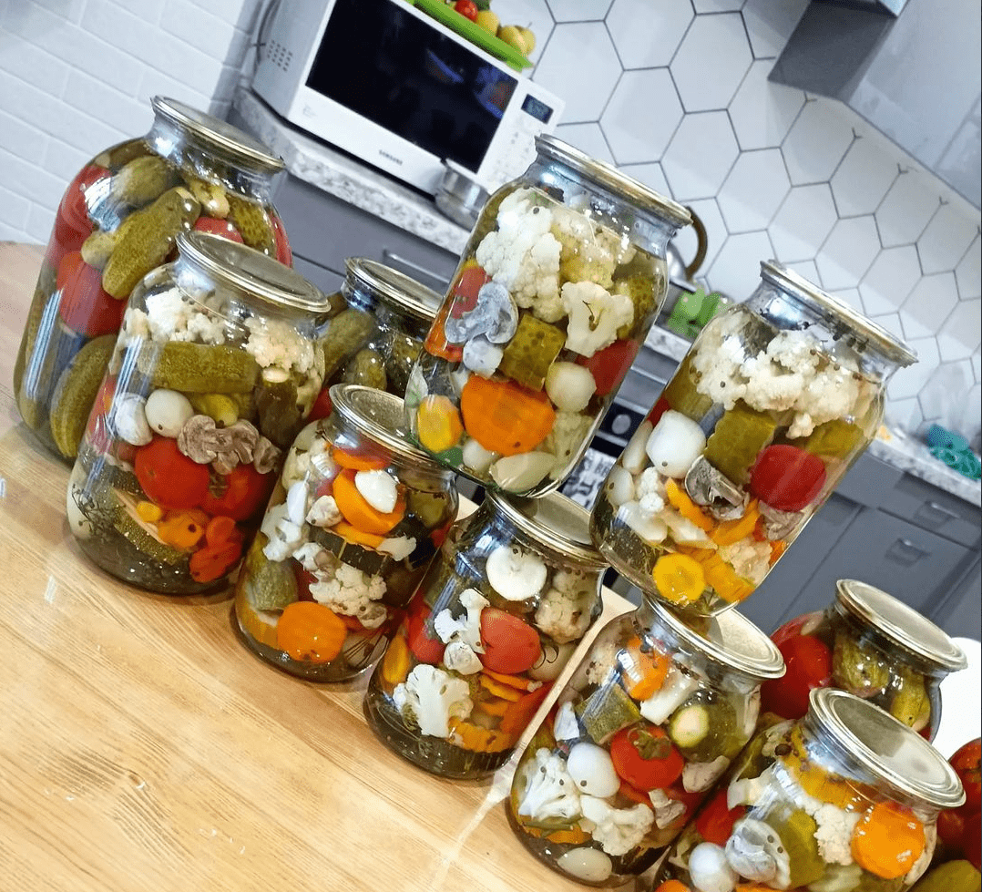Шикарний рецепт (без стерилізації) за рахунок маринаду, в баночку йдуть будь-які овочі, що є в наявності: помідори, огірки, кабачки, перець, баклажани, гриби, морква, цибуля, білокачанна капуста, броколі, цвітна капуста, кукурудза, патисони і т. д.