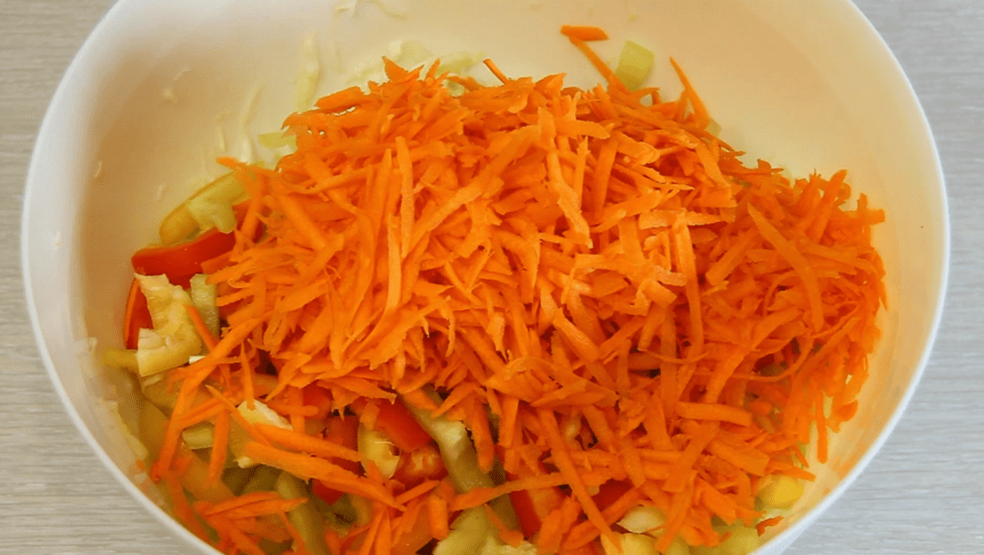 До капусти додайте болгарський перець, цибулю та моркву. Моркву можна нарізати соломкою чи натерти на велику тертку.