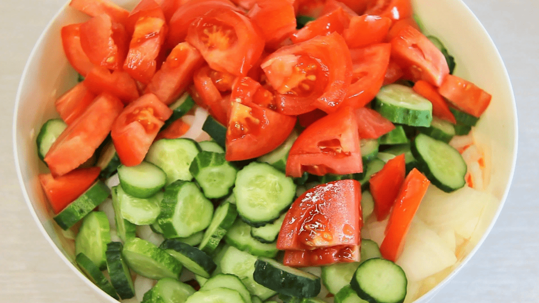 Далі свіжі огірки, нарізані кружальцями та свіжі помідори. Помідори краще брати щільні та пружні.