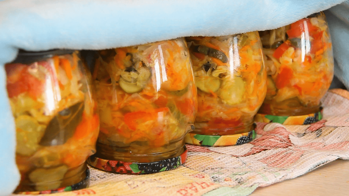 Банки з закускою переверніть догори дном, укутайте чимось теплим і залиште так до їхнього повного остигання.