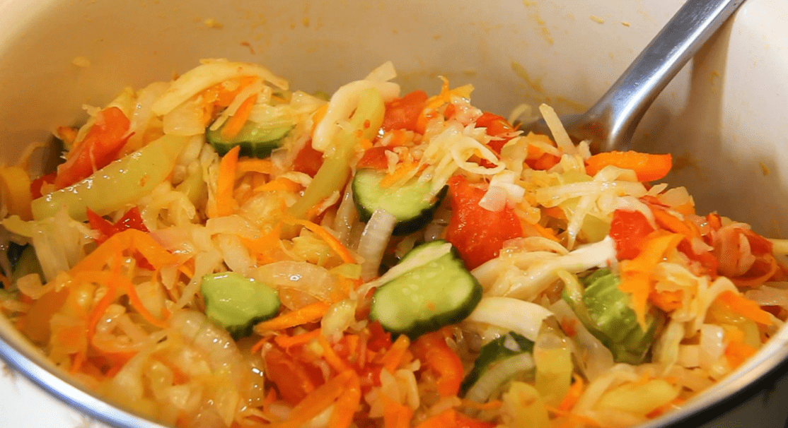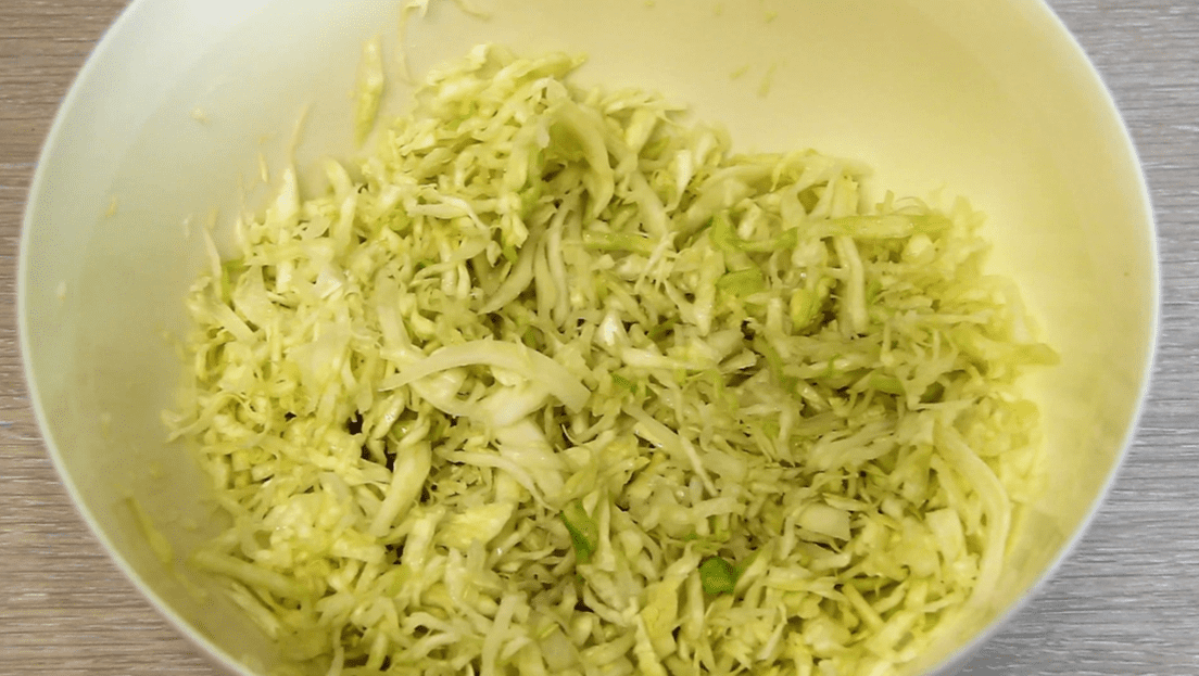 Капусту, нашатковану тонкою соломкою, потрібно посолити (половина від норми солі) і злегка пом’яти руками.