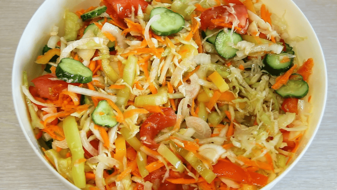 Для салату знадобиться: білокачанна капуста, помідори, свіжі огірки, болгарський перець, морква, цибуля. Овочі потрібно вимити, почистити та нарізати.