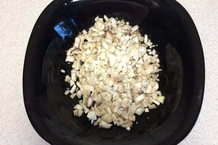 3. Нарізати ніжки печериць дрібним кубиком і викласти у миску.