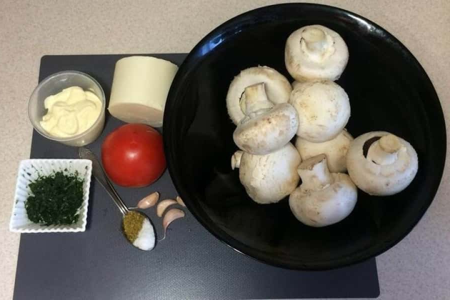 1. Підготувати необхідний набір інгредієнтів: великі печериці, сир (у мене – моцарелла), майонез (або сметану), зелень (у мене заморожений кріп, можна свіжу), часник, помідори, сіль та спеції за смаком (у мене – італійські трави).
