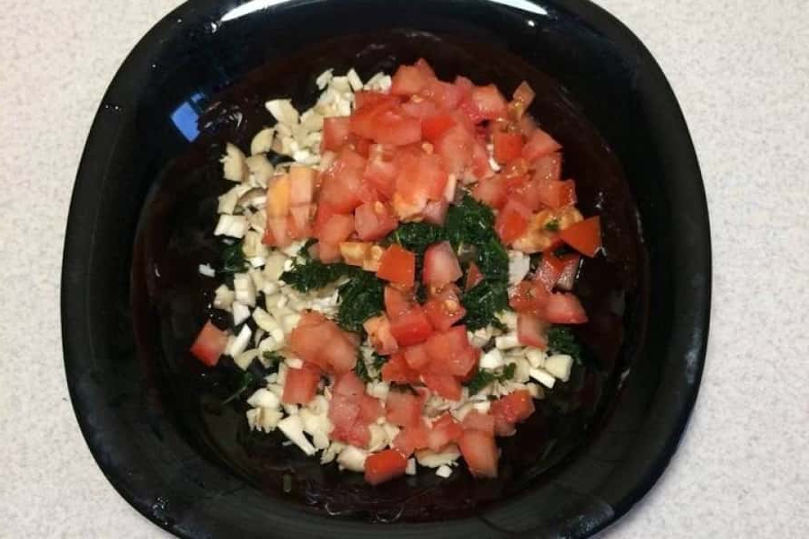 4. Помідори нарізати дрібним кубиком та додати до грибів.