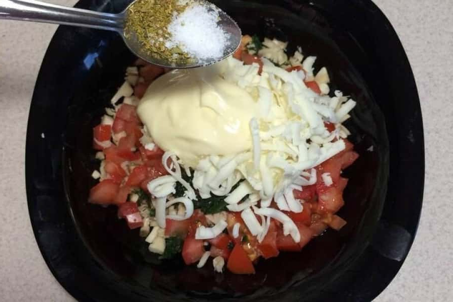 Додати до грибів, помідорів та сиру трохи майонезу, розчавлений через прес часник, сіль та спеції.