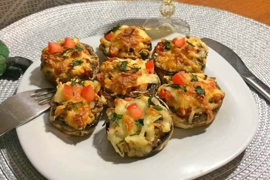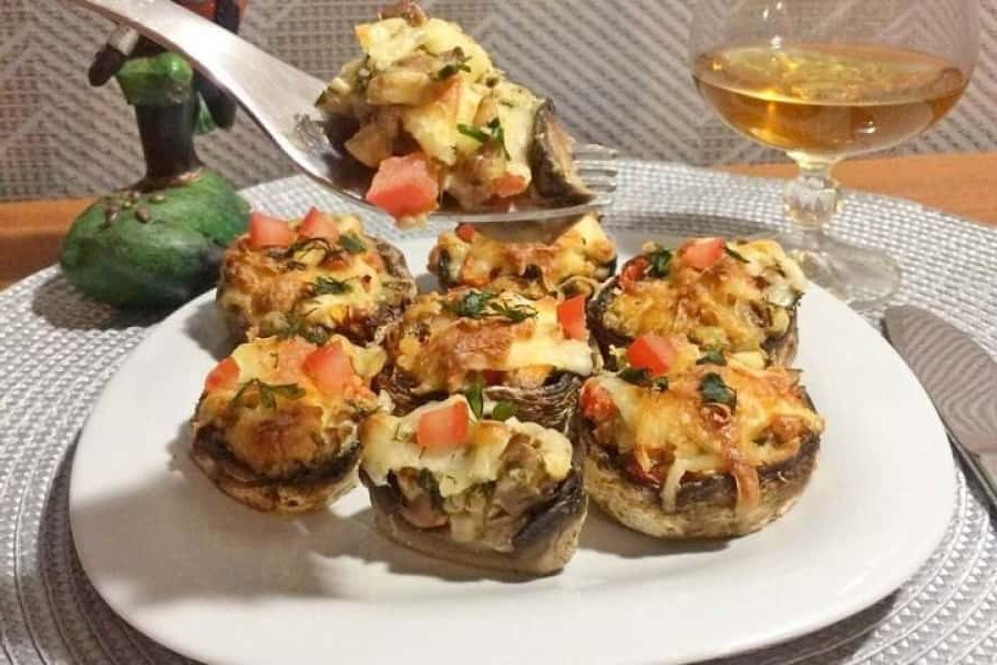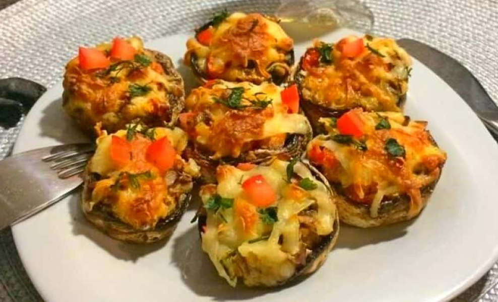 Печериці начиняються ароматною начинкою, у складі якої сир, грибна м’якоть і помідори, і запікаються в духовці під ніжною сирною скоринкою. Завдяки нескладним маніпуляціям виходить найсмачніша закуска для святкового столу. Незважаючи на простоту приготування та досить скромний набір продуктів, виходить дуже смачно, рекомендую неодмінно спробувати!