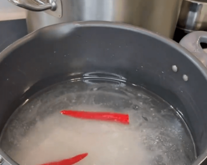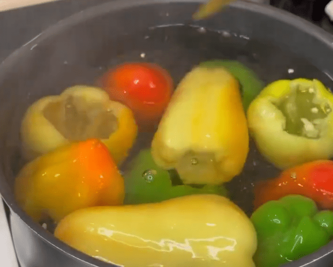 Кип’ятимо воду і проварюємо перчик 2-4 хвилини, до м’якості, треба дивитися, тому що перець буває різний по товщині.