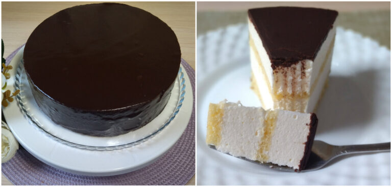 Забираємо в холодильник на 2-3 години, до повного застигання обох шарів. Застиглий торт звільняємо від форми та подаємо до столу.