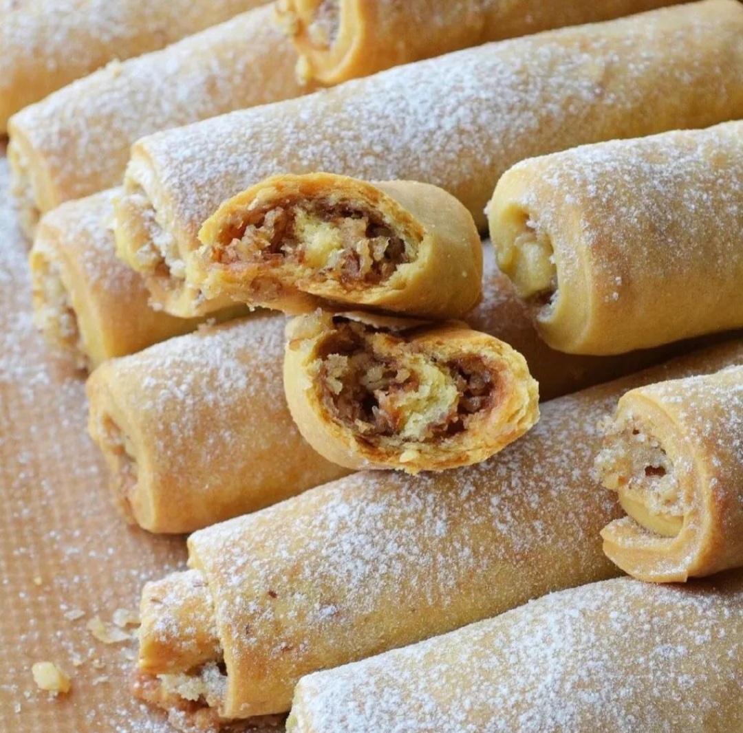 - Розкотити тонкий прямокутний пласт тіста, сформувати шматочки розміром 10х12 см, розподілити по 1 ст. л. начинки на кожному шматочку тіста і згорнути у рулет.