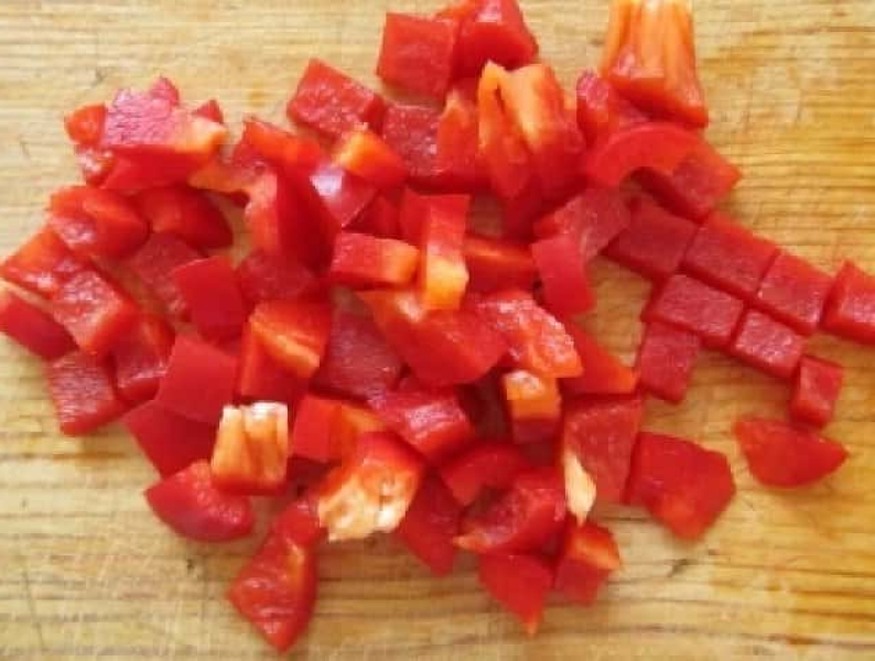 Солодкий болгарський перець очистити від насіння і перегородок і нарізати кубиками.