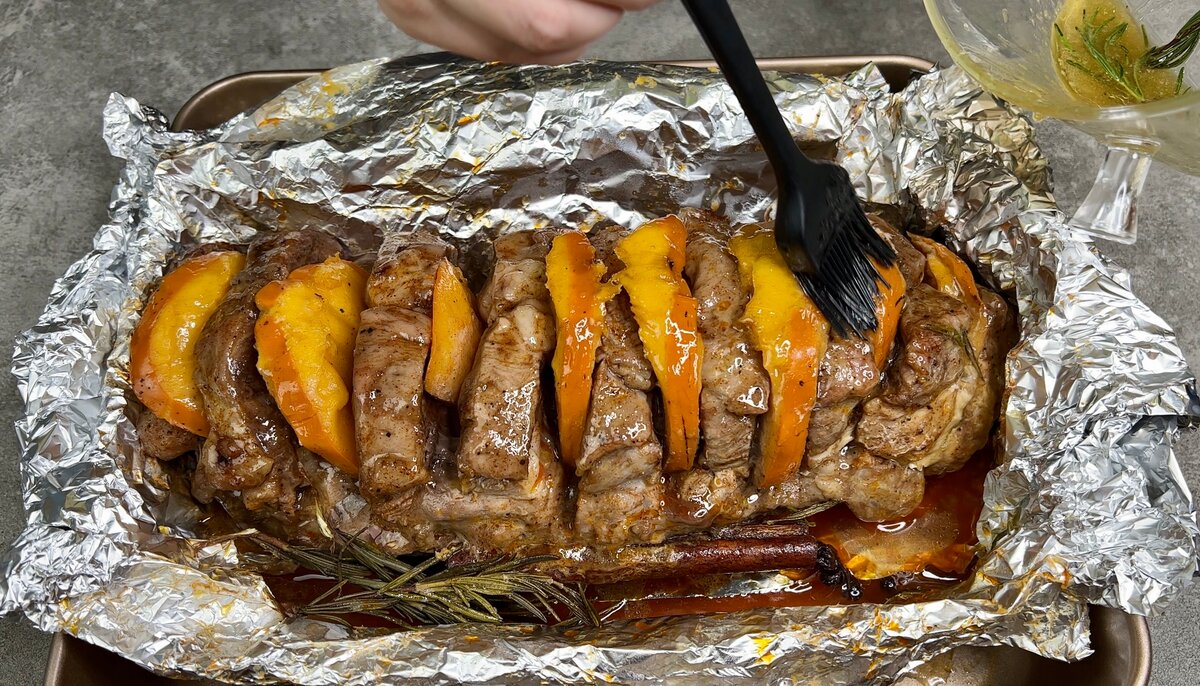 6. Дістаємо м’ясо з духовки, прибираємо зверху розмарин, рясно змащуємо глазур’ю і повертаємо в духовку ще на 10-15 хвилин до утворення рум’яної скоринки.