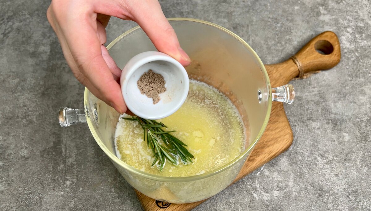 5. У сотейнику або невеликій каструлі розтоплюємо шматочок вершкового масла, закладаємо пару гілочок розмарину, додаємо кардамон, перемішуємо, доводимо суміш до кипіння, прибираємо з вогню, додаємо мед і, ще раз, гарненько перемішуємо.
